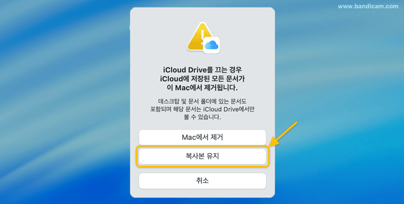 iCloud Drive를 비활성화할 때 뜨는 안내에서 "사본 유지"
